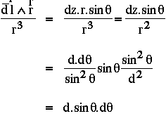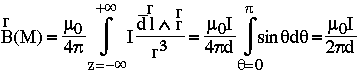 c'est une contribution perpendiculaire au plan de la figure. Pour obtenir le champ total on doit faire la somme le long du fil de ces contributions en tenant compte du facteur géométrique (dl ^ r)/r3 qui varie quand on se promène sur le fil, c'est à dire quand on fait l'intégrale avec z qui varie de - µ à +µ .